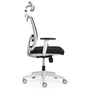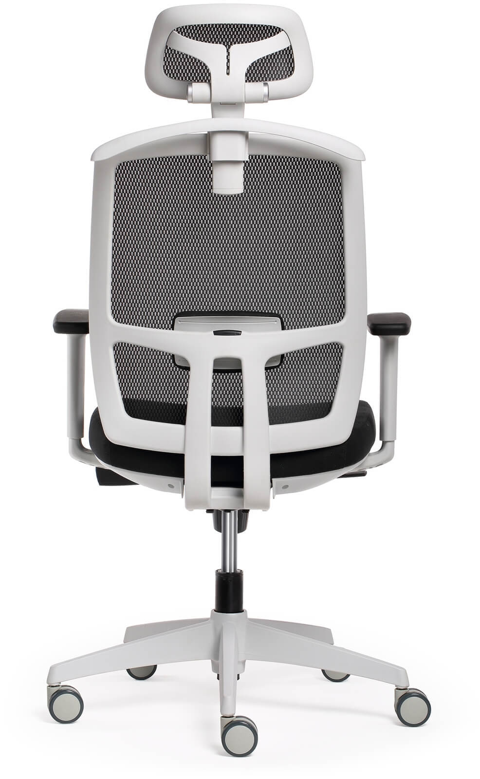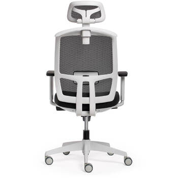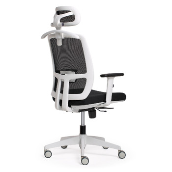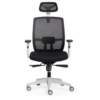 The luminous executive mesh back chair features a modern white frame with upholstered seat and mesh back and headrest.