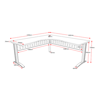 Corner Workstations come with an E1 One-Piece Tabletop with Cable Tidy, Perforated Metal Modesty Panel and Adjustable Feet.