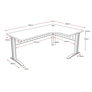Corner Workstations come with an E1 One-Piece Tabletop with Cable Tidy, Perforated Metal Modesty Panel and Adjustable Feet.