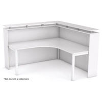 | Instant appeal. Receptions create a great first impression and work seamlessly with the Axis or Aero Desk and Workstations. This stunning reception counter is easy to install and will add a contemporary presence to any reception area. The flexible design can be used as a single unit or joined together to create a commanding foyer feature. Standard Features: Dimensions 1842mm wide x 1842mm long x 1130mm high x 30mm (30cm) deep. Desk Options The below desks in 1800 x 1800 size will fit inside the Axis Corner Reception |