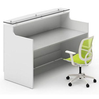 Modern simple designed reception counter finished in white Melamine front and side panels with white glass hob top supported on chrome pillars. Matt White Melamine desktop.