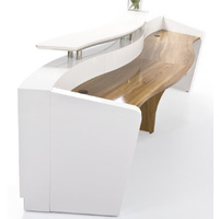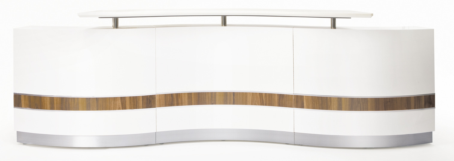 The Martinique reception features a gloss white over all with teak colour desk top and white caesar stone top.