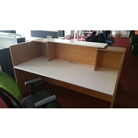 Modern simple designed reception counter finished in Beech Melamine front and side panels with White feature hob. Matt White Melamine desktop.