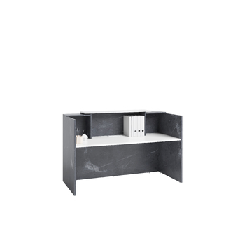 Modern simple designed reception counter finished in marble patterned melamine front and side panels with marble patterend grey feature hob. Matt White Melamine desktop.