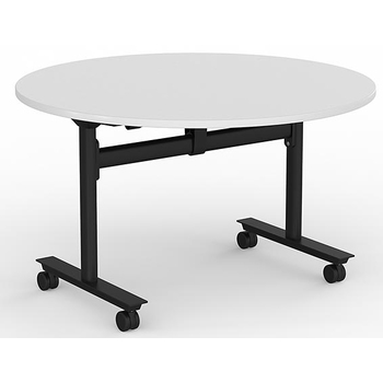 Agile Flip table with black powdercoat frame and 25mm melamine worktop. Swiveling lockable castors. Strong flip mechanism includes safety stay upright locks.