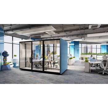 Rapidline pods are designed to add both aesthetic appeal and flexibility to the office space, while providing a calm and relaxed work environment. They are sound reducing and equipped with multiple power outlets and air ventilation, making them a comfortable place to work alone or in groups.